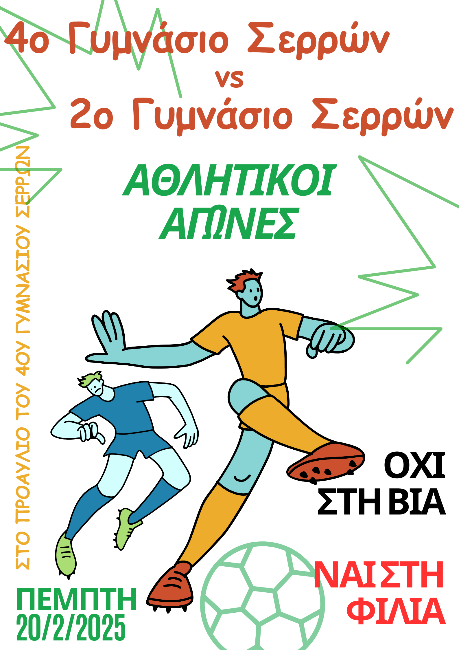 Την Πέμπτη 20-2-25 και ώρα 11:10-13:40 στον αύλειο χώρο του σχολείου μας θα έχουμε τη χαρά να φιλοξενήσουμε μαθητές/ριες του 2ου Γυμνασίου Σερρών με τους καθηγητές τους , καθώς θα συνδιοργανώσουμε από κοινού Δράσεις για την Ημέρα του Φιλάθλου.